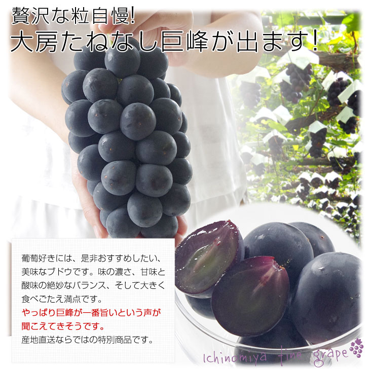 ギフト対応 JAふえふき 一宮支所 から産地直送します 名称: 特大 種なし巨峰 原産地:山梨県 内容量:約1.8キロ(3房) 贅沢な粒自慢! 大房たねなし巨峰が出ます! 葡萄好きには、是非おすすめしたい、美味なブドウです。