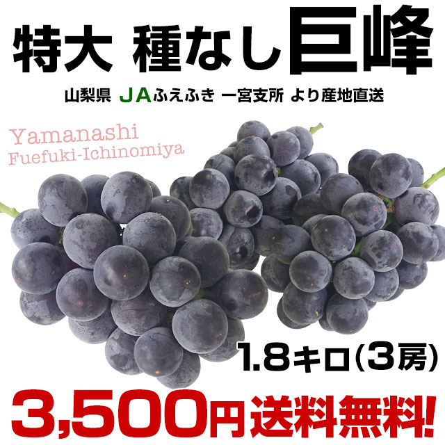 送料無料 山梨県から産地直送 JAふえふき 一宮支所 特大 種なし 巨峰 1.8キロ(3房)